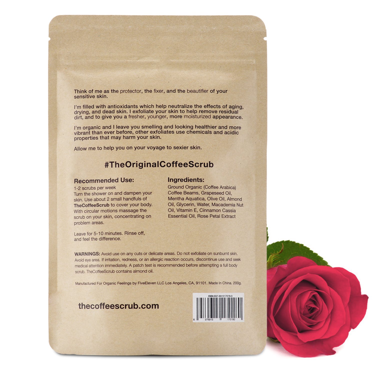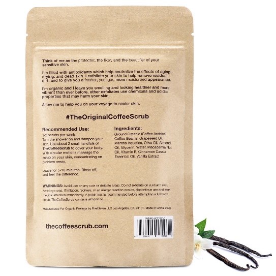 100% Organic Arabica Coffee, The Coffee Scrub is made with Ground Organic Coffee Beans, Grapeseed Oil, Mentha Aquatica, Olive Oil, Almond Oil, Glycerin, Water, Macadamia Nut Oil, Vitamin E and Cinnamon Cassia Essential Oil.